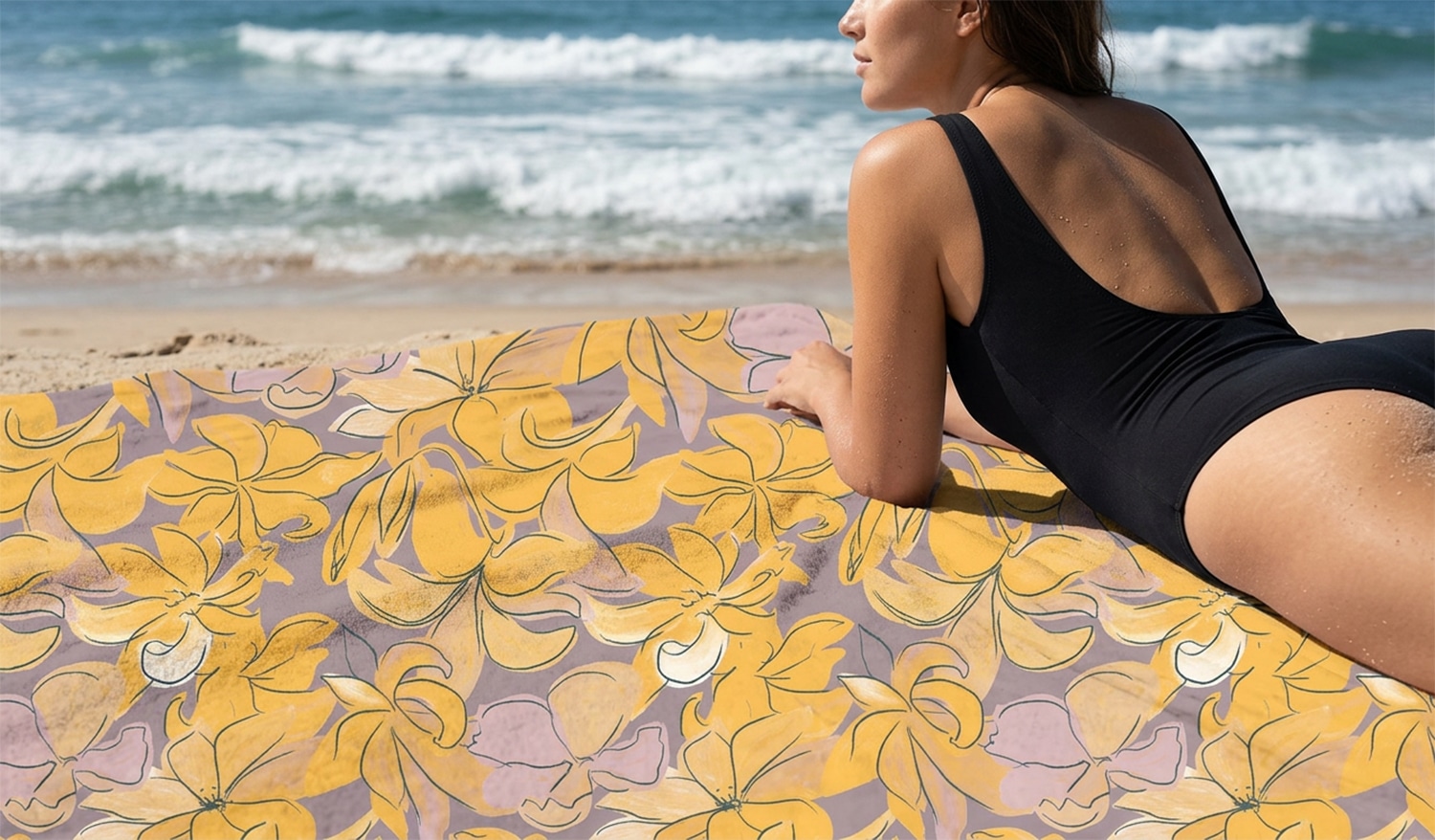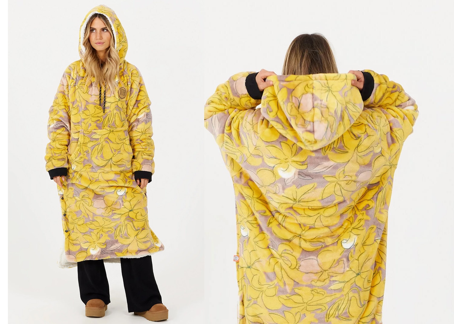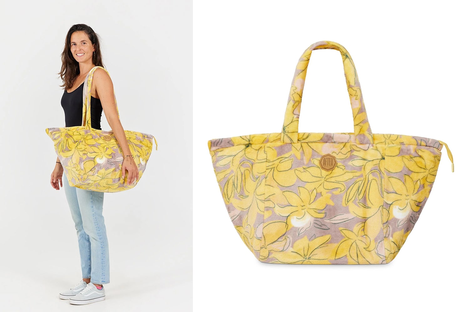 Découvrez ce motif peint à la main, composé de grandes fleurs généreuses aux couleurs chaudes, mêlant des tonalités de jaune et de gris doux. Imprimé sur des ponchos en polaire pour se réchauffer après le surf ainsi que sur des sacs de plage au style à la fois élégant et solaire. Collab’ After essentials comme toujours.